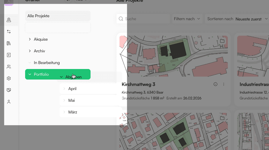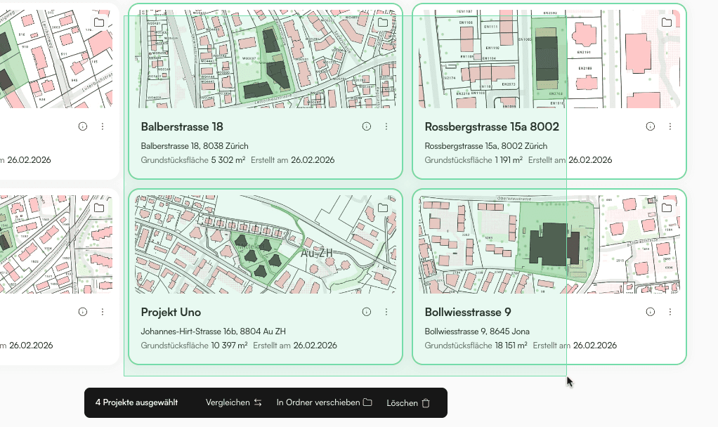 Wähle ein oder mehrere Projekte durch Ziehen oder Klicken aus. Mit Shift+Klick wählst du einen Bereich aus, mit Cmd+Klick / Ctrl+Klick einzelne Projekte. Verschiebe sie dann über In Ordner verschieben, oder ziehe sie direkt auf einen Ordner in der Seitenleiste.